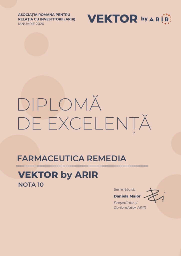 Farmaceutica REMEDIA a obținut, pentru al cincilea an consecutiv, nota 10 în evaluarea VEKTOR realizată de ARIR – Asociația Română pentru Relația cu Investitorii. Această recunoaștere confirmă angajamentul continuu al companiei pentru o comunicare transparentă, consecventă și aliniată celor mai bune practici de guvernanță corporativă.